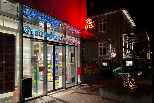 Außenansicht der Gertruden Apotheke bei Nacht. Die Glasfassade ist hell beleuchtet, über dem Eingang leuchtet das rote Apotheken-A. Das Schild „Gertruden Apotheke“ ist in Blau und Rot beleuchtet. Rechts ist ein historisches Gebäude aus Stein zu sehen.